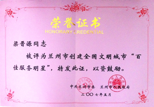 我司梁总被中共兰州市委评为兰州市创建全国文明城市”百佳服务明星“。